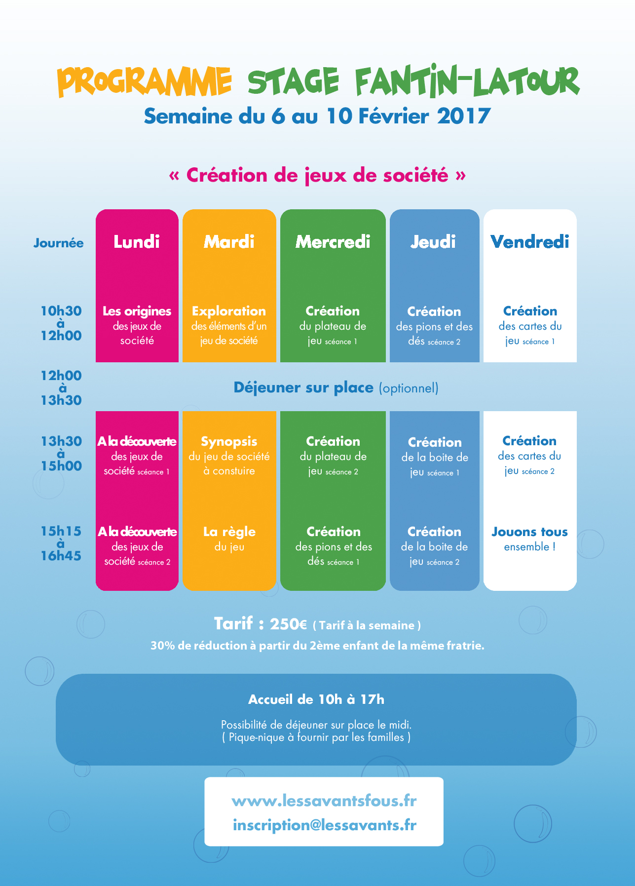 Pour ces vacances d’hiver, les Savants Fous proposent à vos enfants de plonger au cœur de l’univers des jeux de société du lundi 6 au vendredi 10 février 2017.