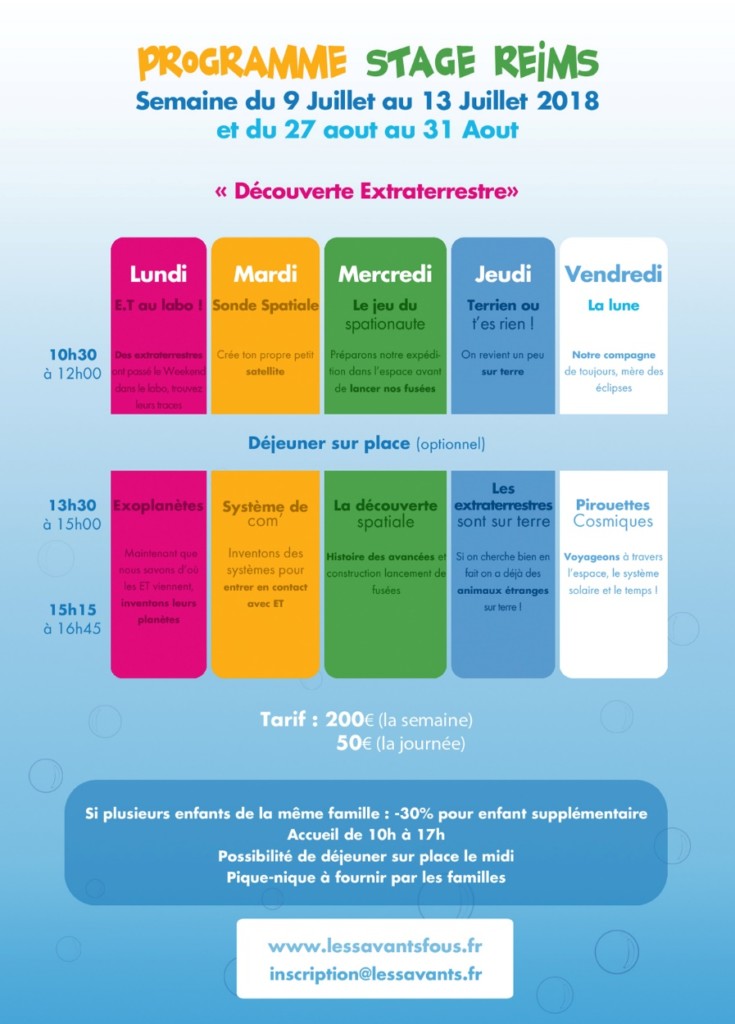 Si vous souhaitez inscrire vos enfants, n’hésitez pas à nous contacter au 06 59 18 39 77 ou par mail à l’adresse contact.reims@lessavants.fr