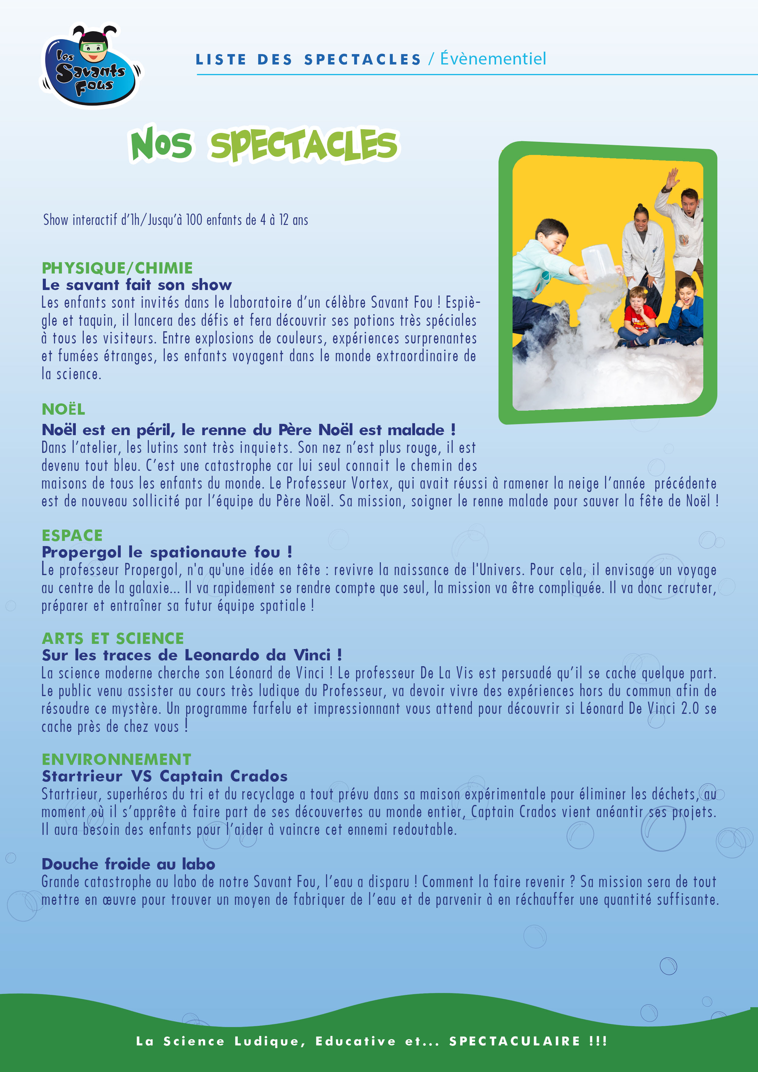 Les enfants sont invités dans le laboratoire d’un célèbre Savant Fou ! Espiègle et taquin, il lancera des défis et fera découvrir ses potions très spéciales à tous les visiteurs. Entre explosions de couleurs, expériences surprenantes et fumées étranges, les enfants voyagent dans le monde extraordinaire de la science.