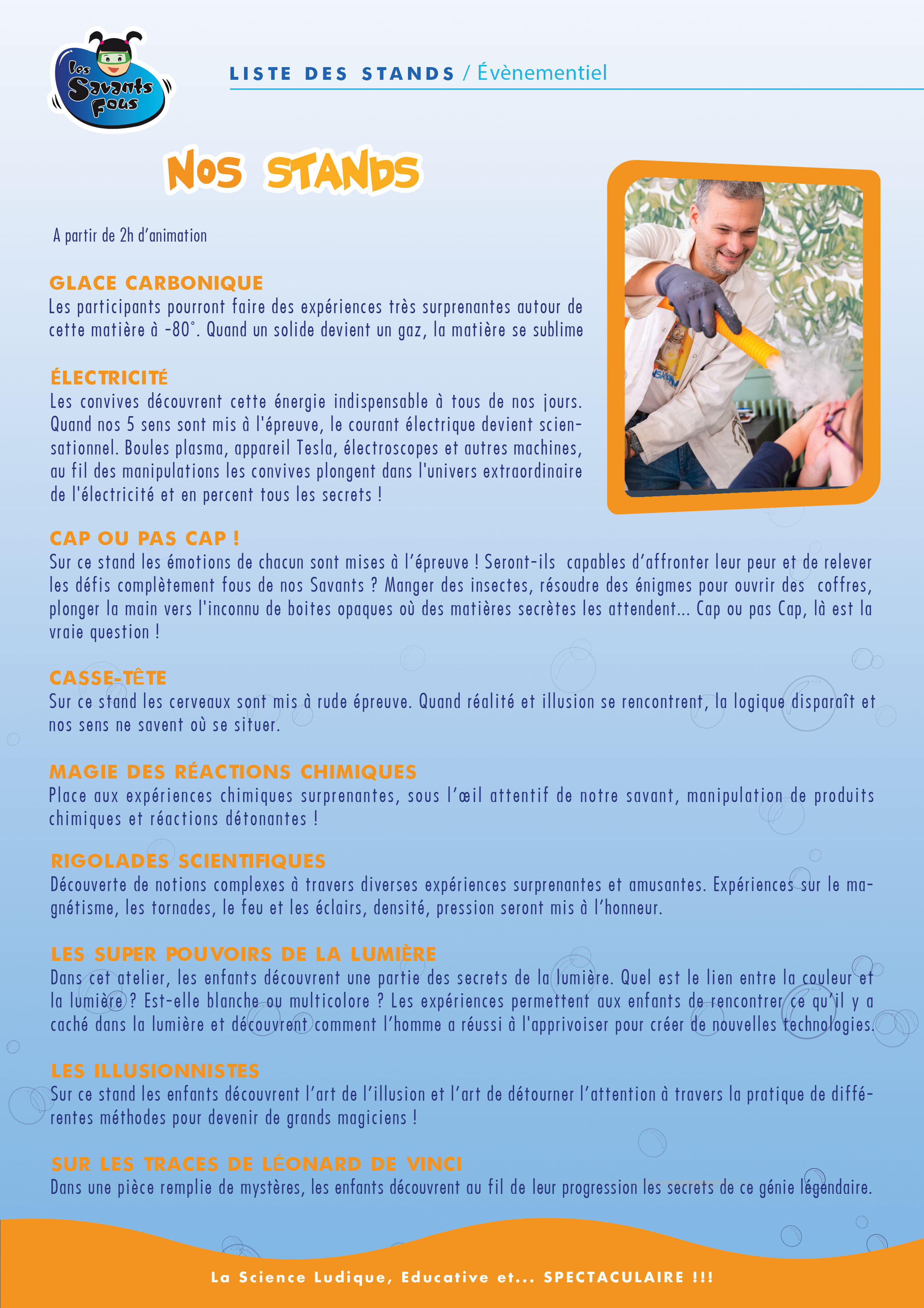 Avec leurs stands scientifiques, les Savants Fous répondent à de nombreuses demandes d’animations pour des lieux de passage : salons, fête d’entreprise, kermesse, journée portes ouvertes, etc.