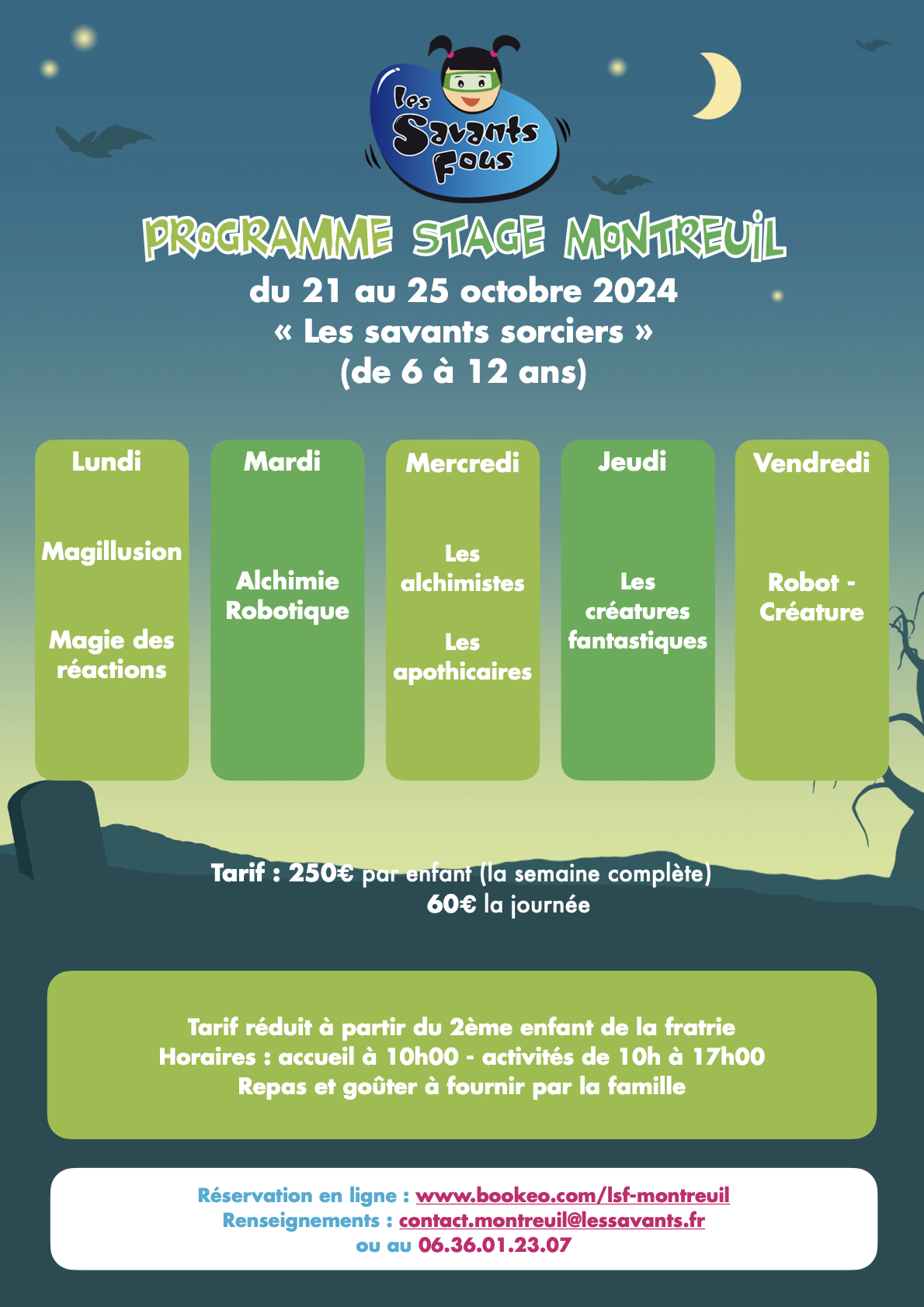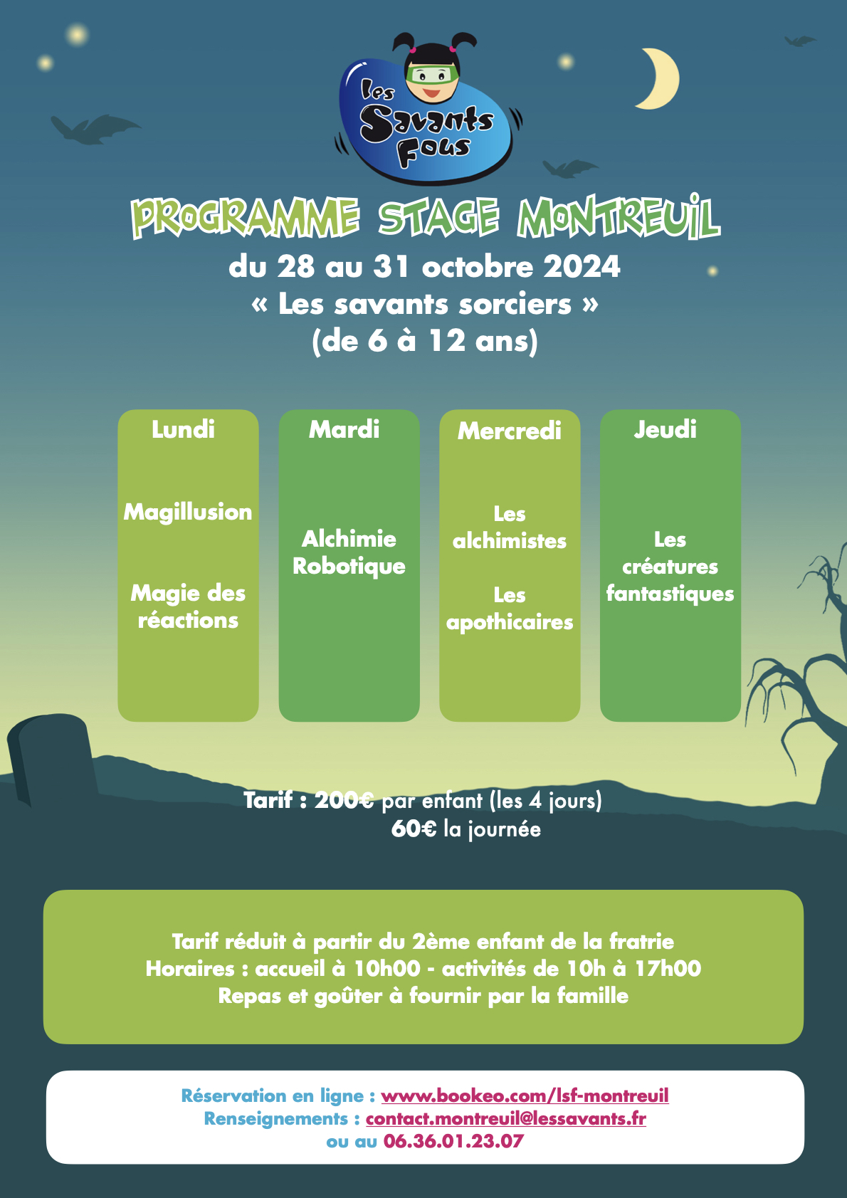 Du 21 au 25 ou du 28 au 31 octobre, notre local de Vincennes accueillera vos petits curieux pour une semaine de stage sur le thème des “Savants Sorciers”. 🧙♂️🔬