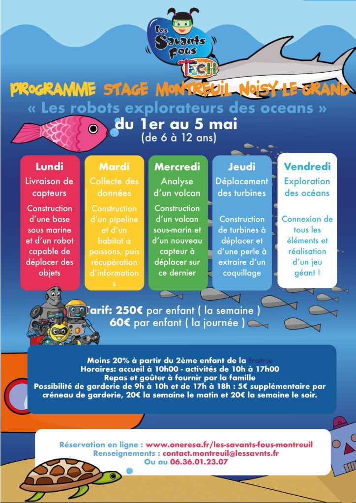 Du lundi 1er au vendredi 5 mai 2023 : un stage robotique et programmation avec “Les robots explorateurs des océans” Vos enfants partiront en exploration de nos océans et leur profondeur grâce à nos robots explorateurs…