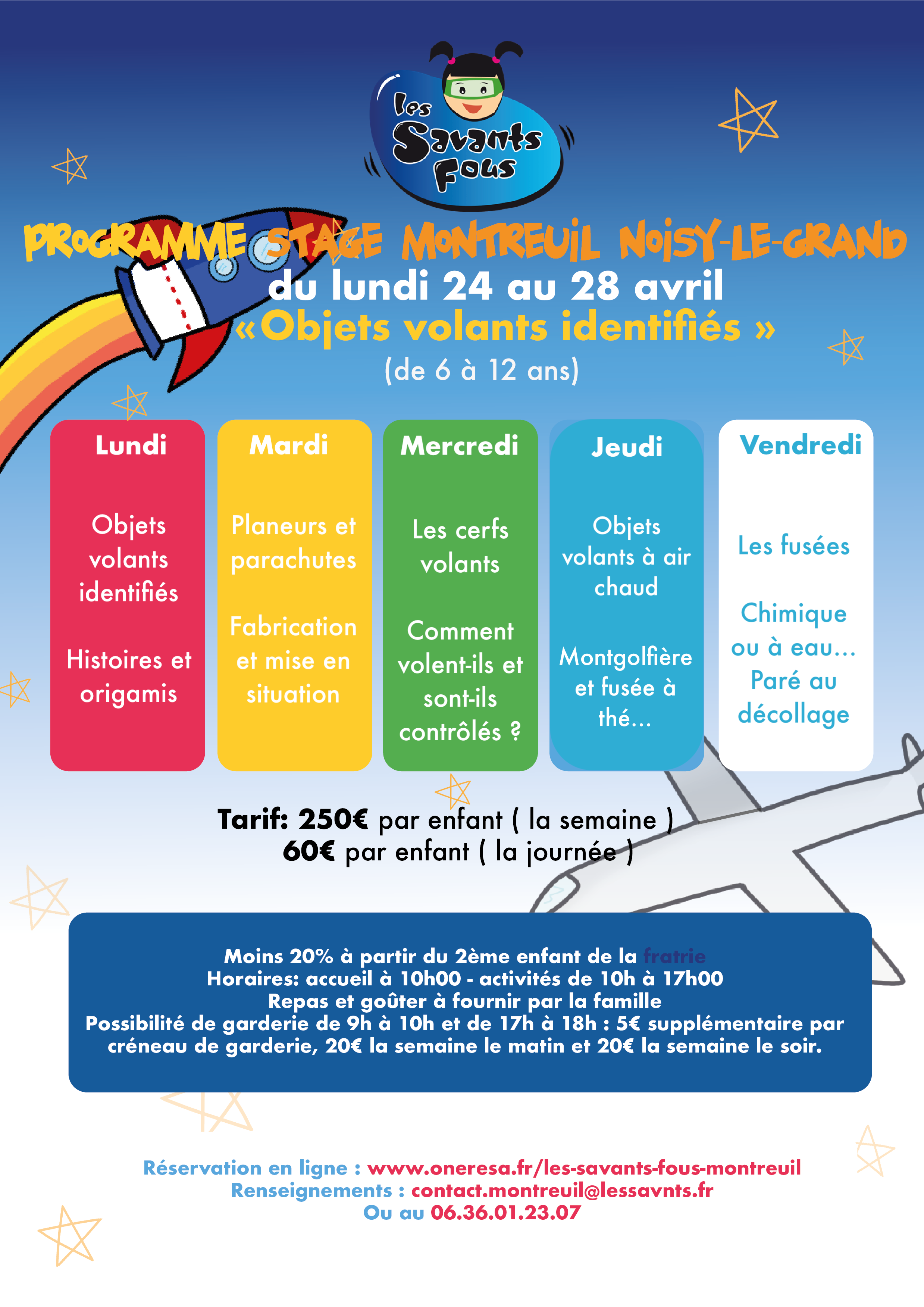 Du lundi 24 au vendredi 28 avril 2023 : un stage scientifique sur le thème des “Objets Volants Identifiés” Vos enfants partiront à la découverte de différents objets volants qu’ils pourront eux même fabriquer et tester en plein air…