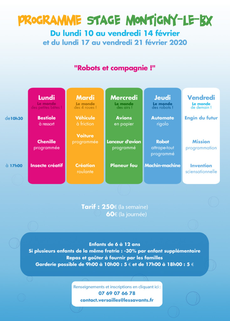 Cet hiver, vos enfants partent à la découverte de mondes merveilleux. Chaque jour, ils explorent de 3 manières différentes un univers fabuleux : le matin, ils bricolent un spécimen mécanique, en début d’après-midi ils programment les robots Algora, et après le goûter, place à la créativité pour une invention unique.