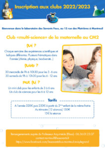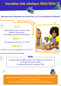 Nous attendons vos petits et grands curieux dans notre « laboratoire fou » à partir du samedi 10 septembre pour un maximum d’expériences, de manipulations et de plaisir autour des sciences et de la robotique !!! Vos enfants feront des découvertes surprenantes et amusantes tout au long de l’année et partageront un moment convivial avec de nouveaux camarades…