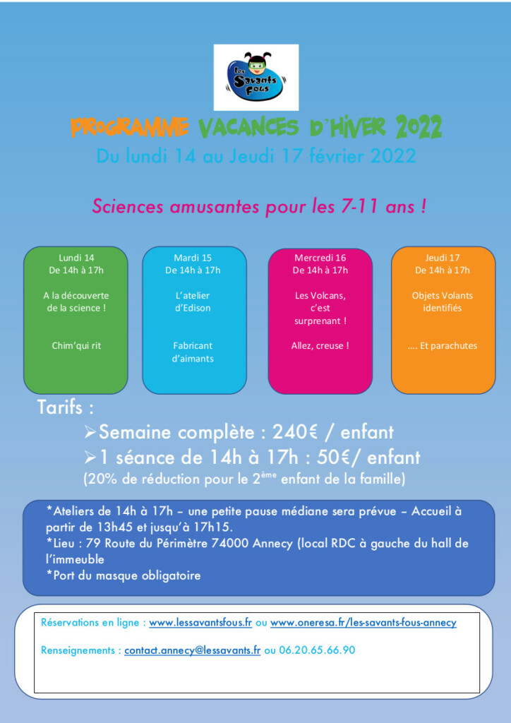 >>>L’après-midi de 14h à 17h, pour les 7-11 ans, un stage de sciences variées avec de la physique, de la chimie, de la géologie… Mélanges, phénomènes rigolos, constructions étonnantes…