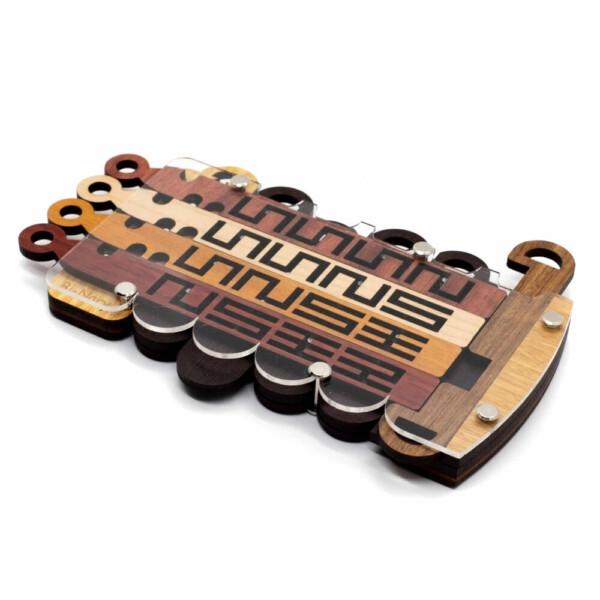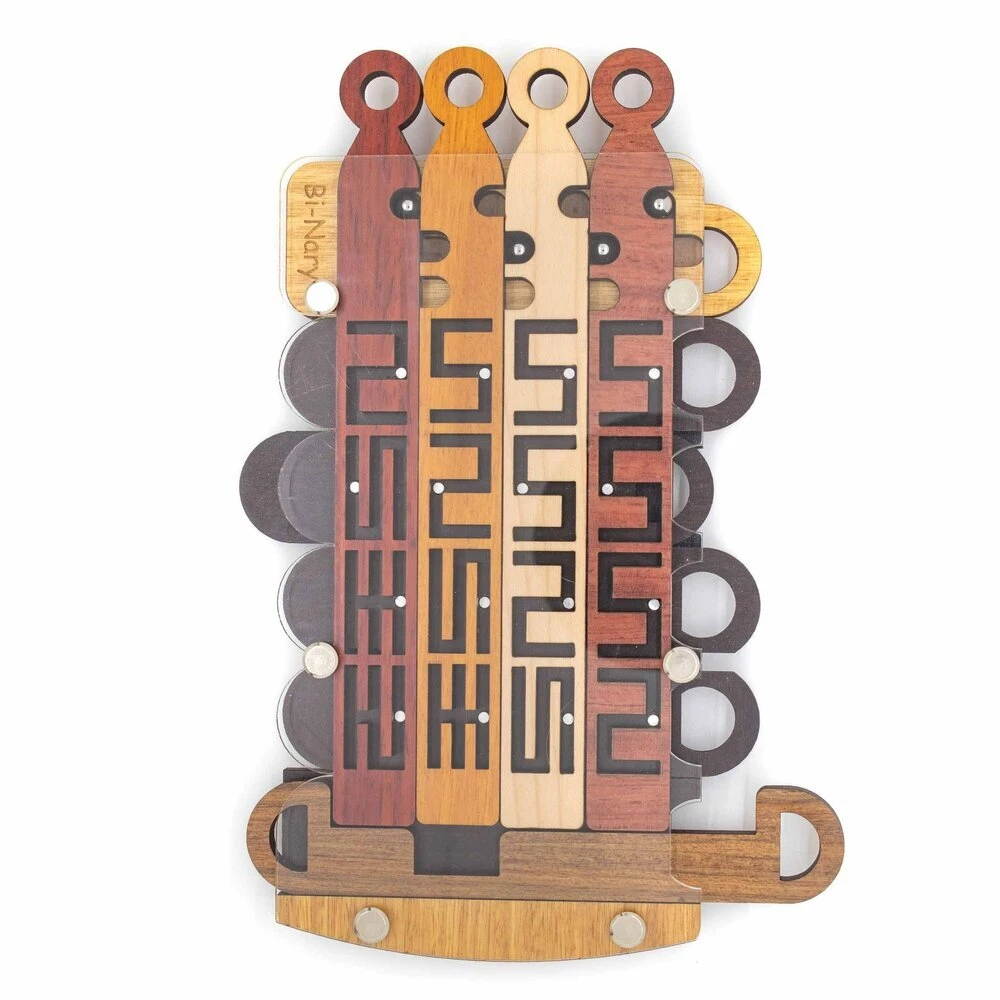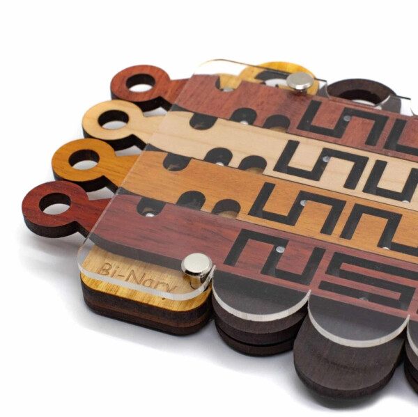 Le Bi-Nary est un imposant et luxueux casse-tête en bois, acier et plexiglas. Tu devras te frotter à 4 labyrinthes horizontaux et leurs 4 billes en acier pour sortir la pièce en bois coulissante du bas.