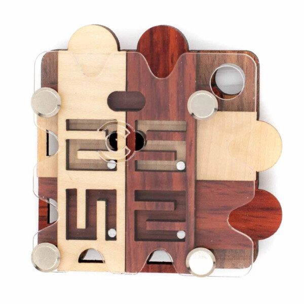 Dans ce labyrinthe en bois, on retrouve des tracés en forme de S. Il faudra orienter le plateau et faire coulisser les plaques de bois pour sortir la bille d’acier du circuit. Ce labyrinthe initie à la logique et la manipulation.