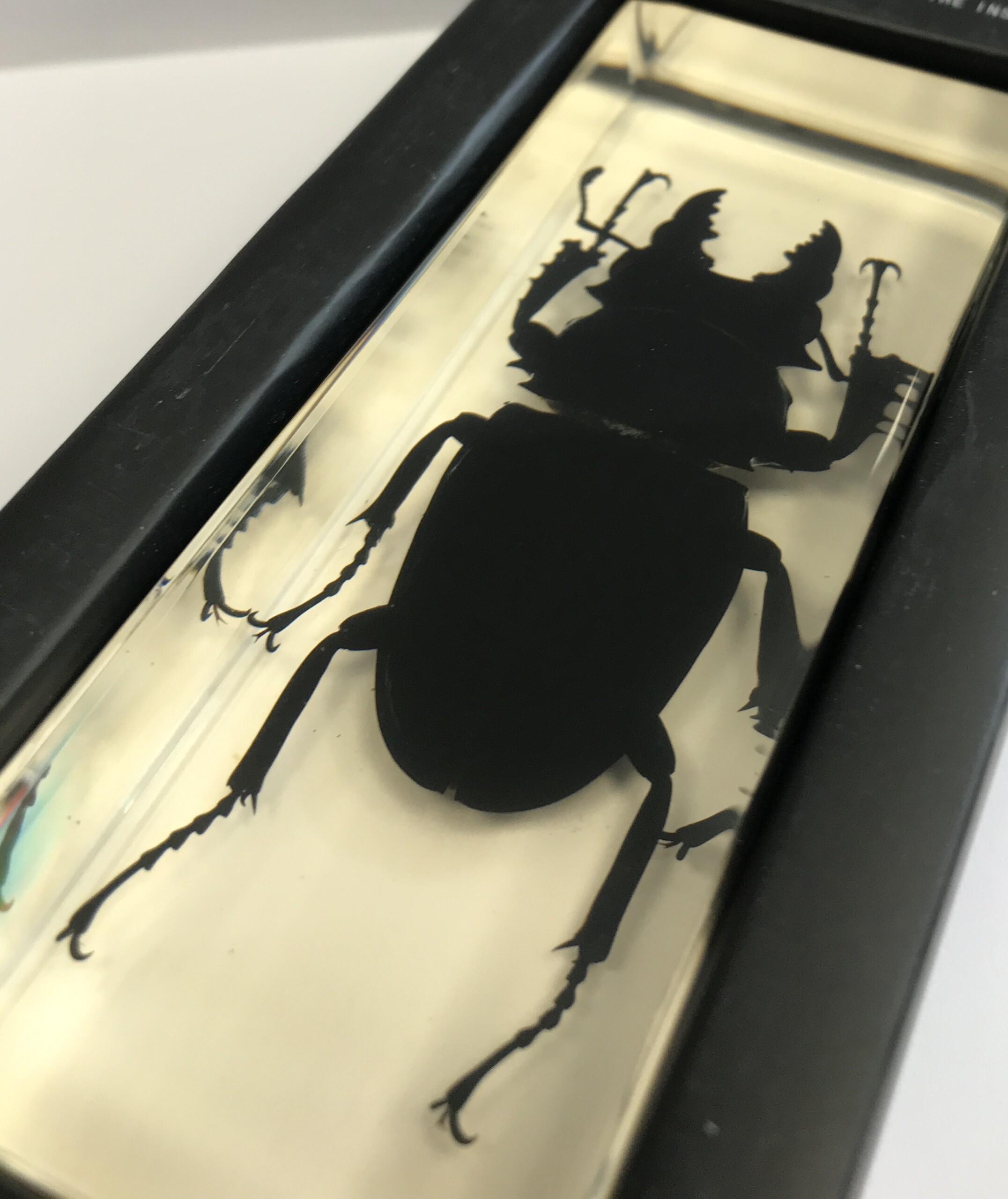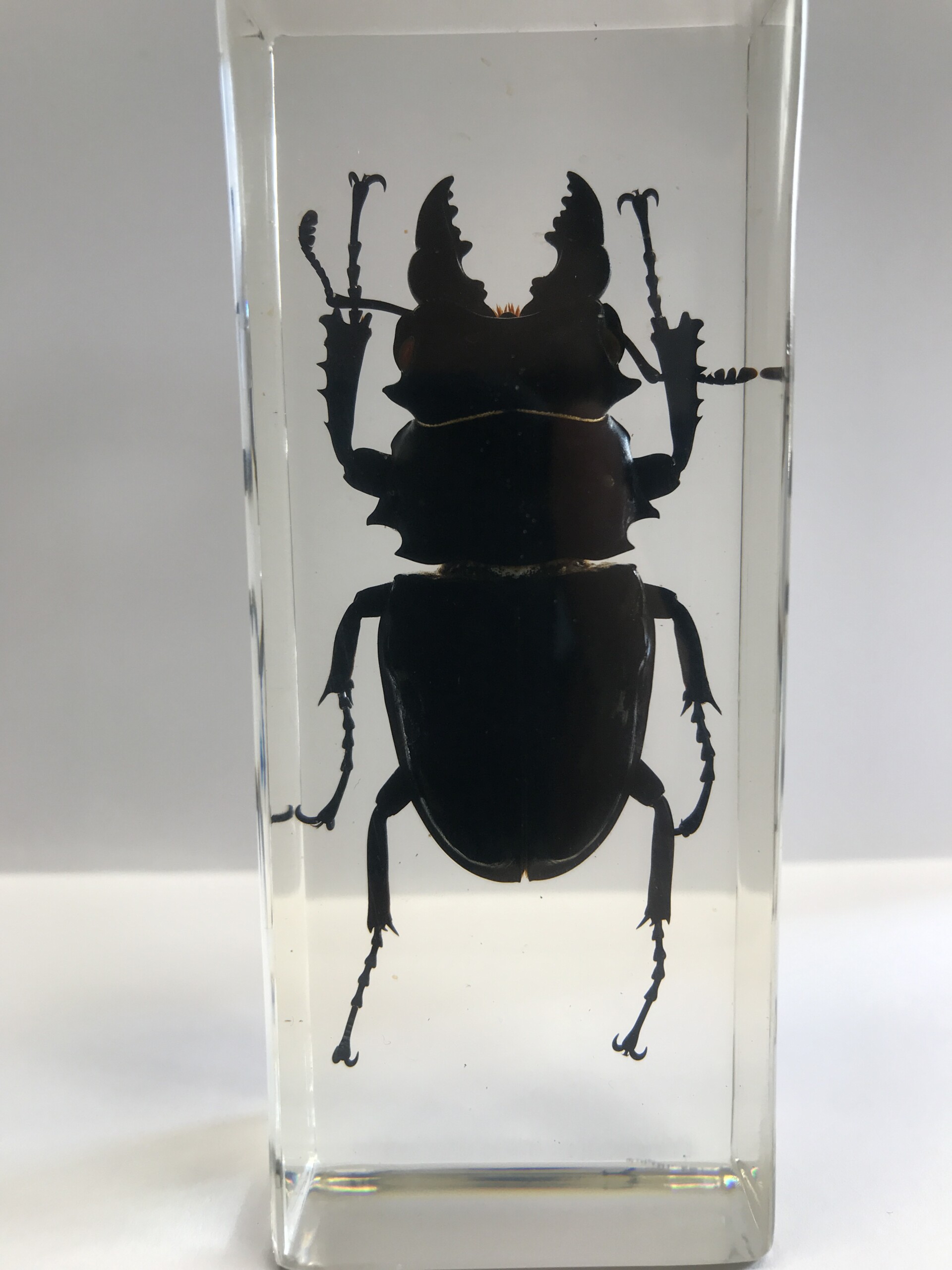 Découvrez l’entomologie avec ce curieux insecte naturalisé sous verre. Le Lucane est un insecte qu'on reconnaît à ses mandibules à piques. C'est le plus grand coléoptère d'Europe. Ce spécimen est une grande femelle car ses mandibules sont moins longues que le mâle. Elles sont donc plus puissantes. On les trouve en général dans les forêts, et plus précisément dans les troncs d'arbres morts dont-ils se nourrissent.
