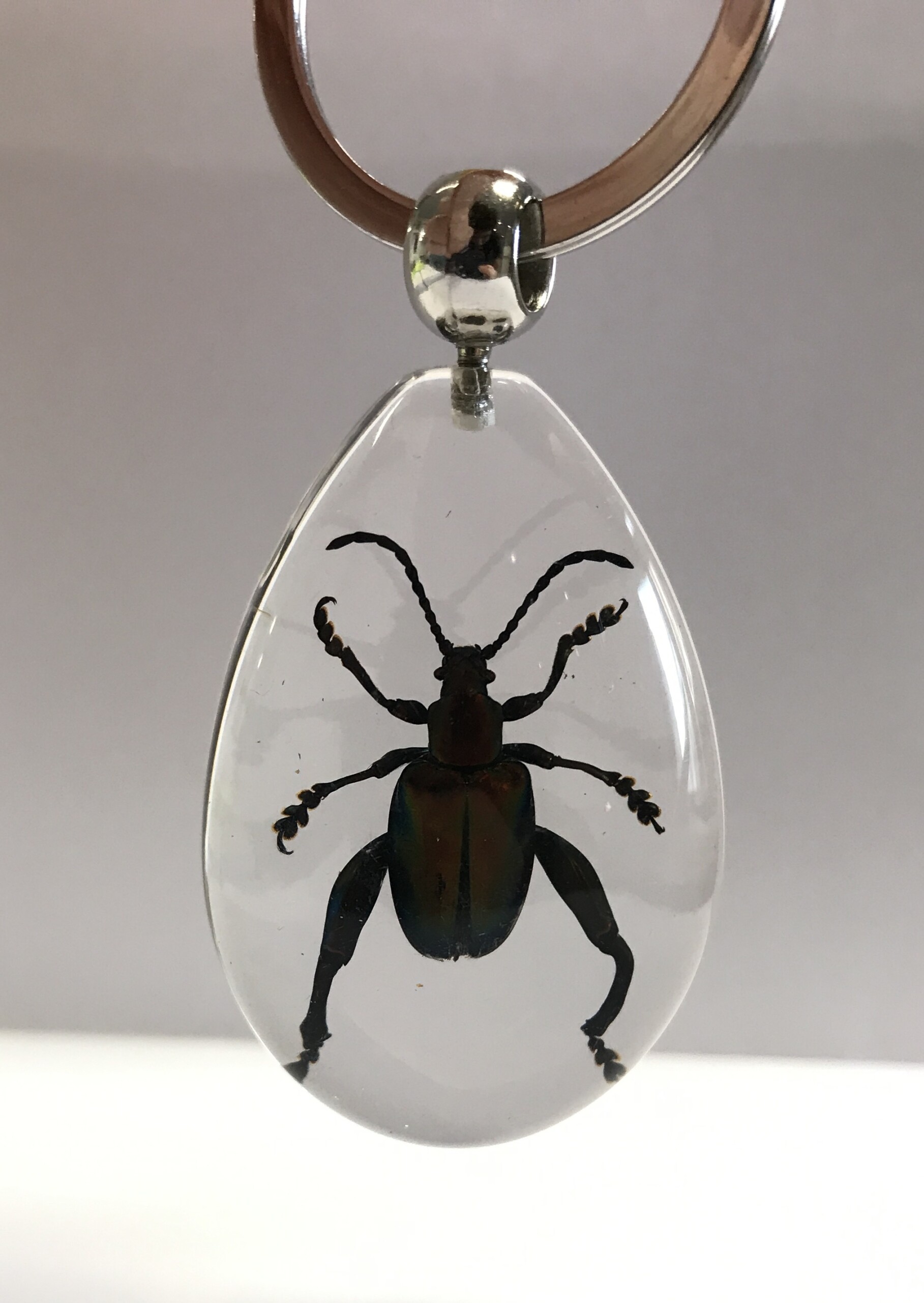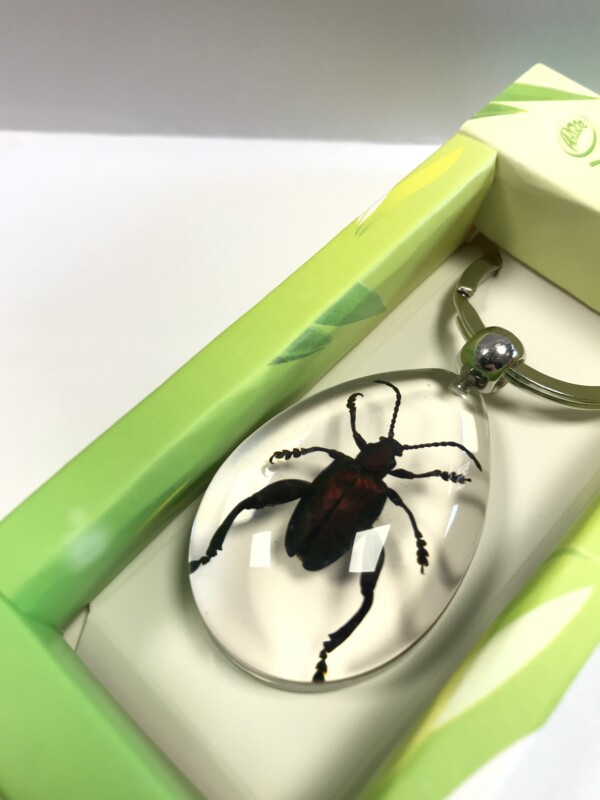Découvrez l’entomologie avec ce curieux porte-clés d’insecte naturalisé sous verre. Cette espèce d’insectes s’appelle "Cafard Grenouille" et porte son nom à cause de ses pattes arrières qui font penser à une grenouille. Ces spécimens sont présents dans les jungles de Thaïlande et de Malaisie. On les reconnaît à leurs ailes de couleur vert métallique et rouge foncé.