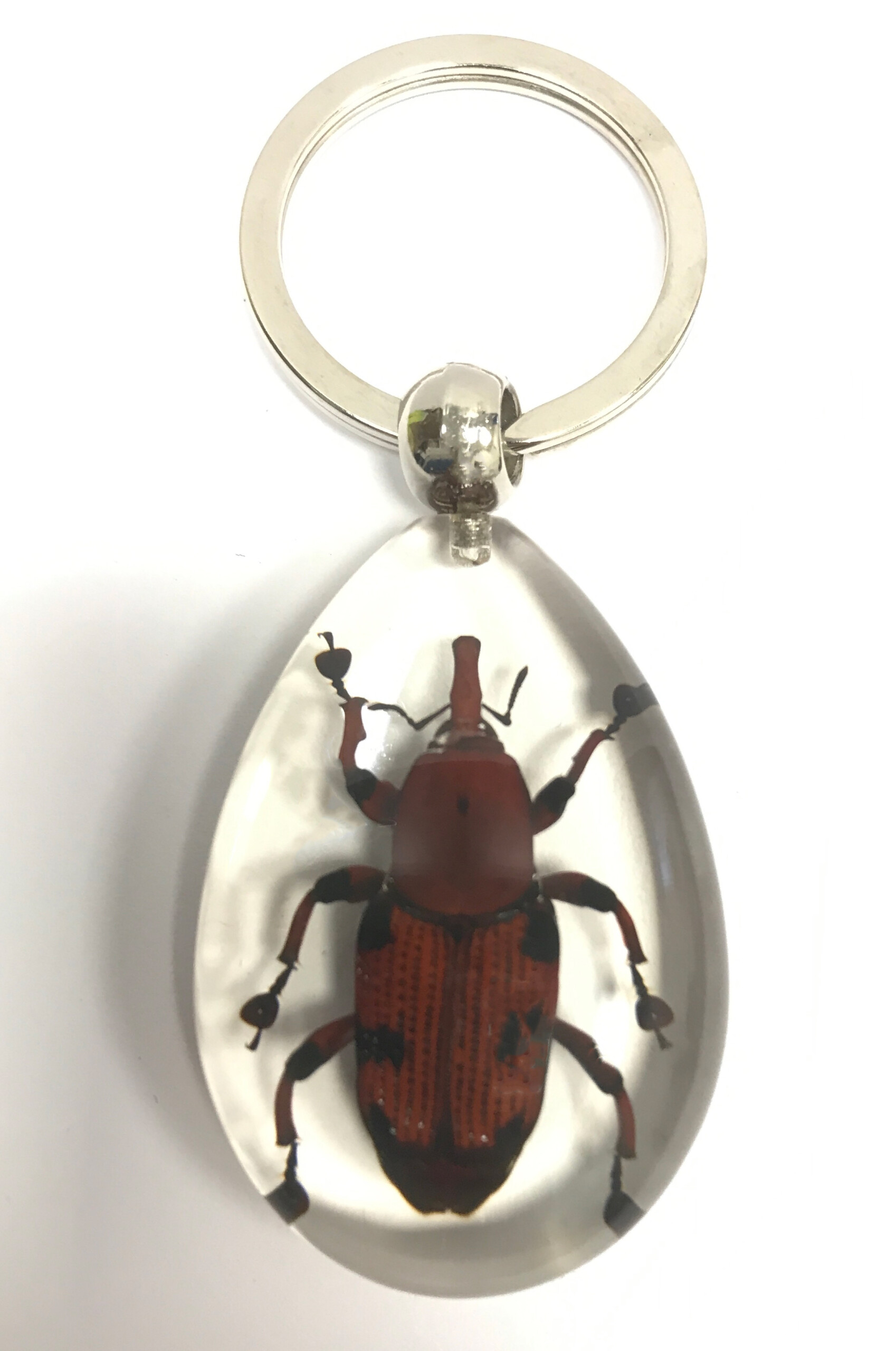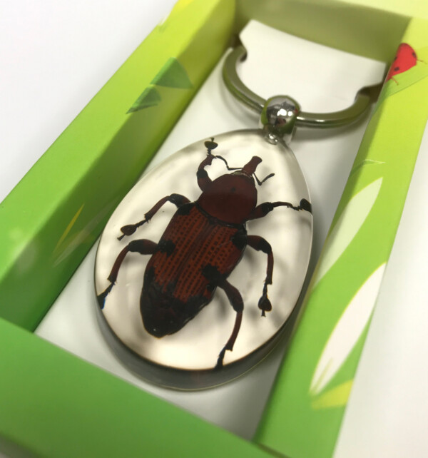 Découvrez l’entomologie avec ce curieux porte-clés d’insecte naturalisé sous verre. Le Charançon du bambou (Cyrotrachelus dux) est un insecte d'Asie qu'on retrouve dans les forêts et plantations de bambou. Cet insecte est considéré comme nuisible car il pond ses larves dans la sève du bambou et tue les plants. Ses longues pattes lui permet de grimper sur les bambous ; sa trompe lui permet de manger la sève du bambou et pondre.