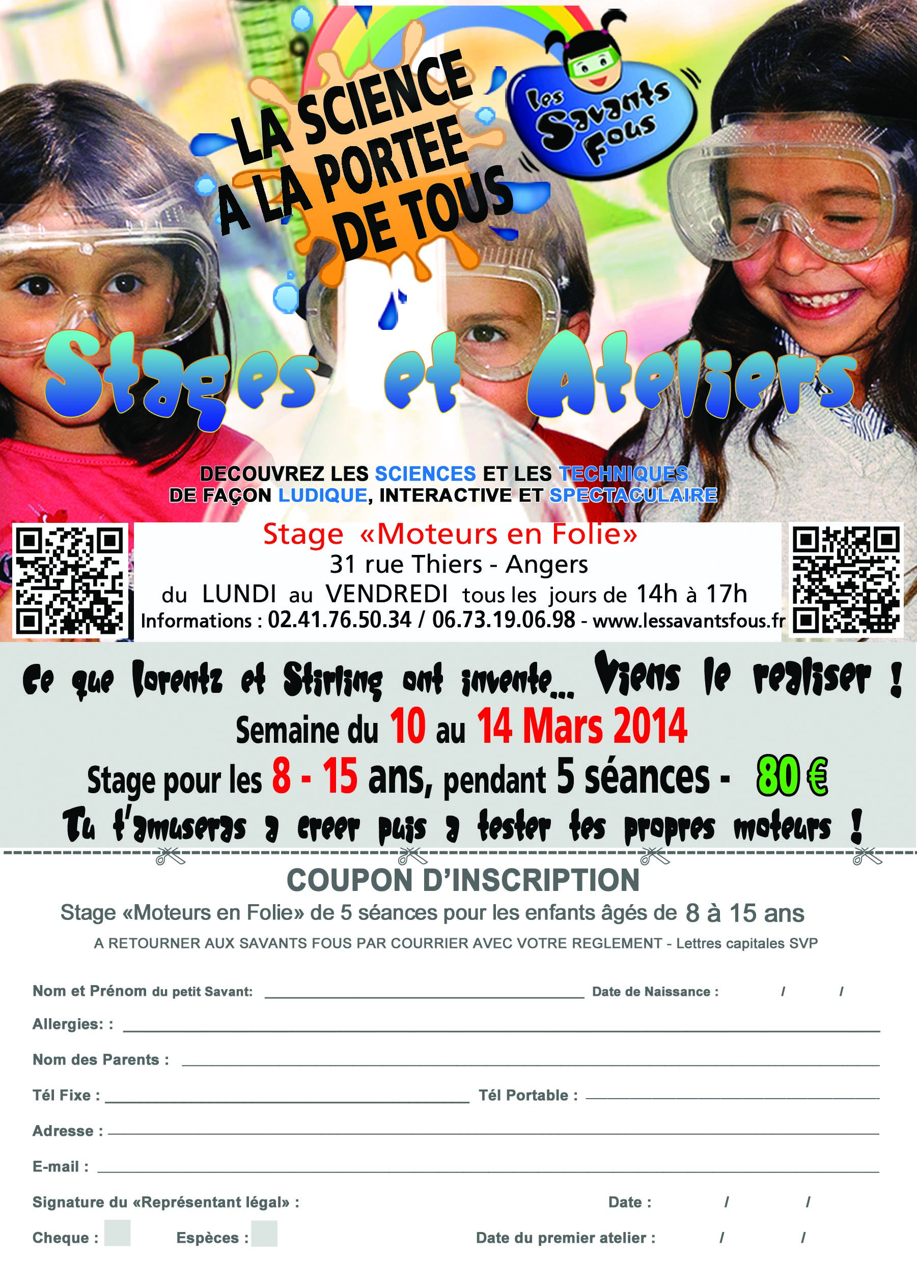 • Semaine du 10 au 14 Mars 2014: Le stage se déroulera tous les après midi de 14h à 17h au 31 rue Thiers à Angers.