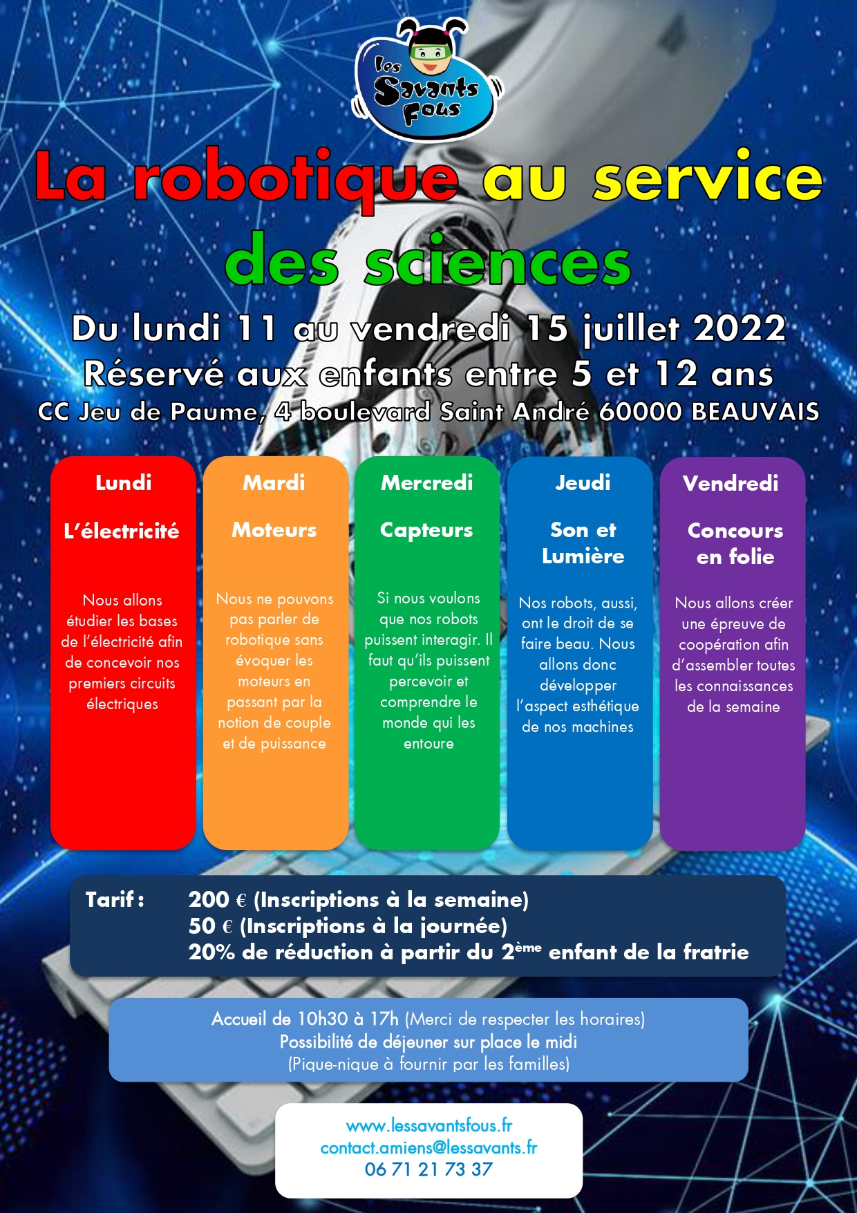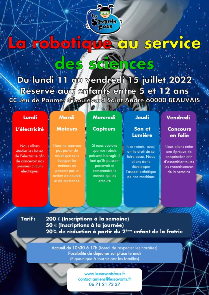 Du lundi 11 au vendredi 15 juillet 2022, les jeunes scientifiques sont invités à s’intéresser au monde qui les entoure et plus particulièrement aux nombreux robots qu’ils côtoient tous les jours.