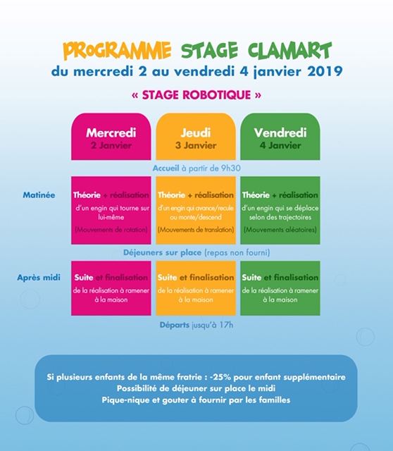 Du mercredi 2 au vendredi 4 janvier 2019, notre Professeur Atoma, après le succès du stage Chimie de la Toussaint, aura le plaisir d’initier les enfants de 6 à 12 ans à la robotique et la création d’engins, dans notre local au 80 rue Emmanuel Sarty à Clamart.