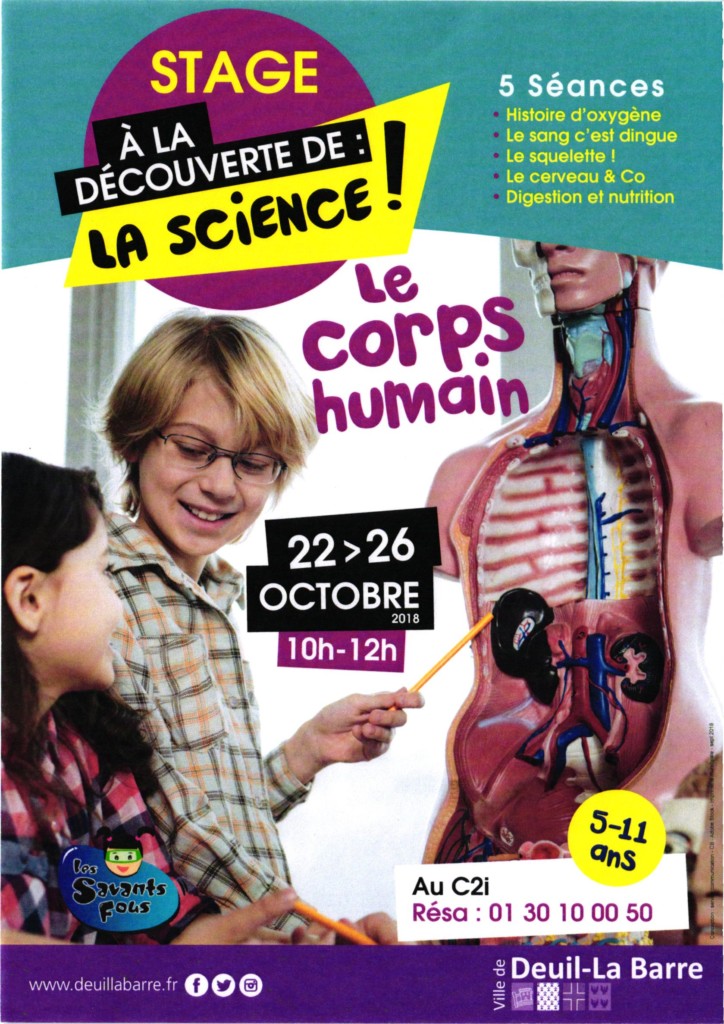 Les Savants Fous invitent vos enfants à participer à un stage sur le corps humain au sein du centre d’information et d’initiative de la ville de Deuil la barre, du 22 au 26 octobre 2018