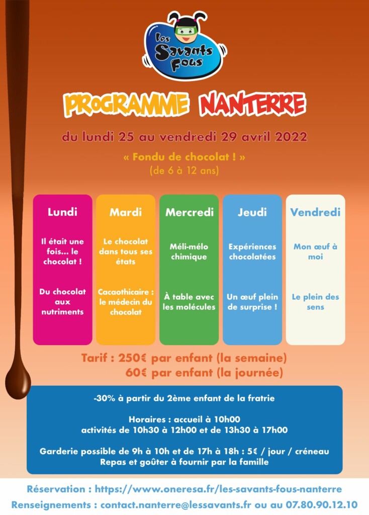 Quand le soleil de printemps pointe le bout de son nez, c’est le bon moment pour parler des vacances de Pâques ! Pour notre semaine de stage qui se déroulera du lundi 25 au vendredi 29 avril, nous vous avons concocté un programme de circonstance puisque nous avons décidé d’utiliser le chocolat comme fil rouge des expériences que nous proposerons à vos enfants ! 😋🍫