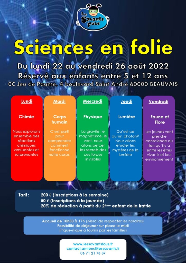 Lors de la dernière semaine des vacances d’été, nous allons accueillir les jeunes de 5 à 12 ans dans notre laboratoire de Beauvais afin d’explorer ensemble divers thèmes scientifiques.