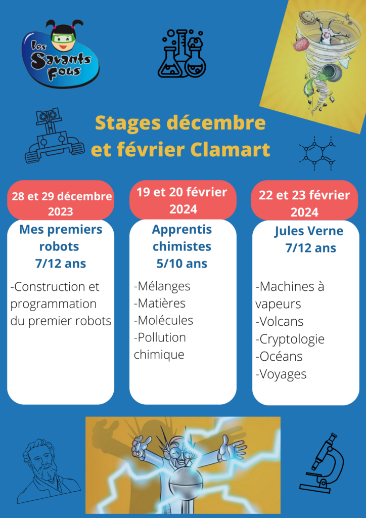 Pour les Vacances de Noël nous vous proposons deux stages à Clamart « Mes premiers robots 7/12 ans » du 28 au 29 décembre (5 places restantes) et « Tintin 5/10 ans » du 4 au 5 Janvier (une seule place restante).