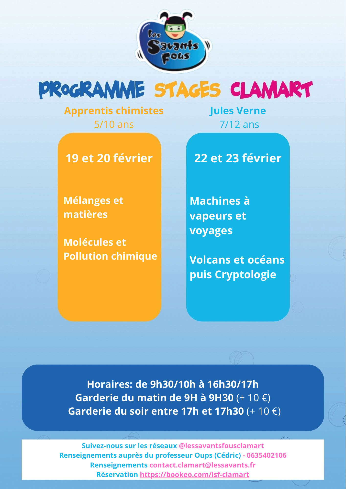 Stage 19 et 20 février 2024 Apprentis chimistes 5/10 ans et Stage 22 et 23 février Jules Verne 7/12 ans.