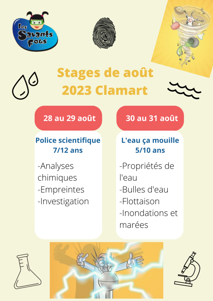 Pour août : « Police scientifique 7/12 ans » du 28 au 29 août, «L’eau ça mouille 5/10 ans» du 30 au 31 août.