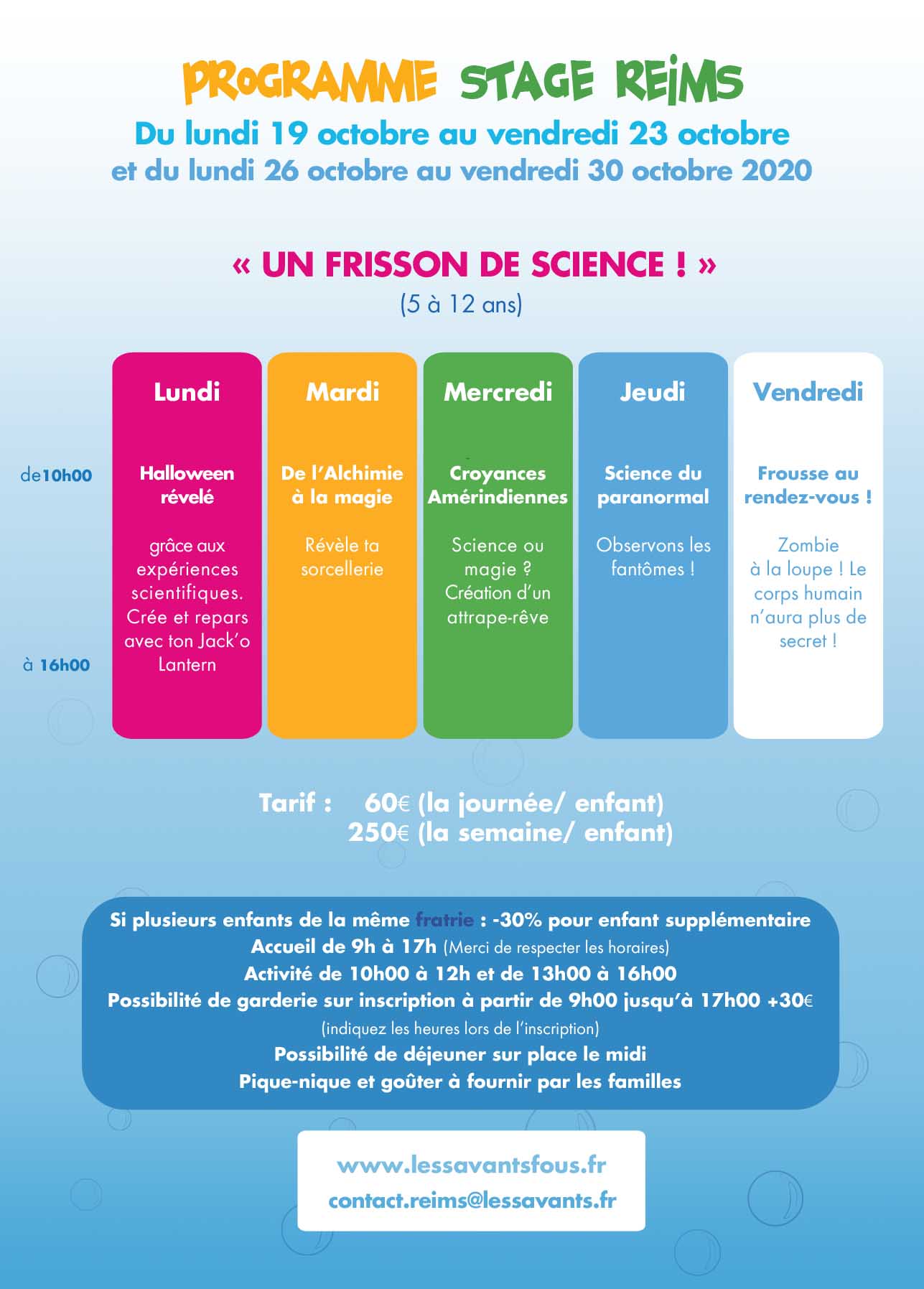 Votre enfant a entre 6 et 12 ans, il est curieux et aime les expériences scientifiques, alors n’hésitez plus. Pour plus d’infos vous pouvez nous contacter au 07.62.47.62.35 ou par mail à l’adresse contact.reims@lessavants.fr ou
