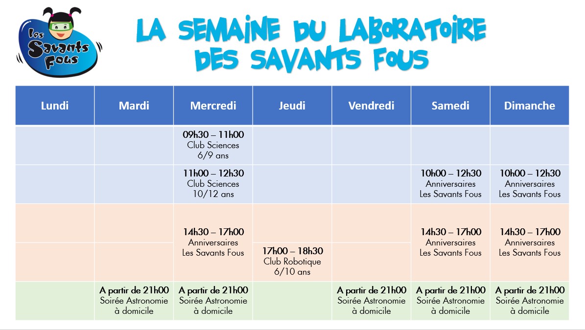 Qu’il s’agisse de notre Club Sciences hebdomadaire pour les 6/8 ans et 9/12 ans ou de notre Club Robotique, vos enfants partent à la découverte du monde des Sciences, de la Robotique et de la programmation pendant 1h30 tous les Mercredis matin et Jeudis soir (Hors périodes de vacances).